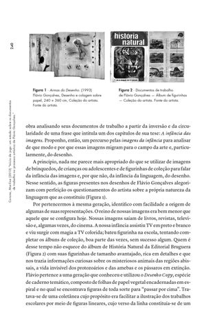 obra analisando seus documentos de trabalho a partir da inversão e da circularidade de uma frase que intitula um dos capítulos de sua tese: A infância das imagens. Proponho, então, um percurso pelas imagens da infância para analisar de que modo e por que essas imagens migram para o campo da arte e, particularmente, do desenho. A princípio, nada me parece mais apropriado do que se utilizar de imagens de brinquedos, de crianças ou adolescentes e de figurinhas de coleção para falar da infância das imagens e, por que não, da infância da linguagem, do desenho. Nesse sentido, as figuras presentes nos desenhos de Flávio Gonçalves alegorizam com perfeição os questionamentos do artista sobre a própria natureza da linguagem que as constituiu (Figura 1). Por pertencermos à mesma geração, identifico com facilidade a origem de algumas de suas representações. O reino de nossas imagens era bem menor que aquele que se configura hoje. Nossas imagens saíam de livros, revistas, televisão e, algumas vezes, do cinema. A nossa infância assistiu TV em preto e branco e viu surgir com magia a TV colorida; bateu figurinha na escola, tentando completar os álbuns de coleção, boa parte das vezes, sem sucesso algum. Quem é desse tempo não esquece do álbum de História Natural da Editorial Bruguera (Figura 2) com suas figurinhas de tamanho avantajado, rica em detalhes e que nos trazia informações curiosas sobre os misteriosos animais das regiões abissais, a vida invisível dos protozoários e das amebas e os pássaros em extinção. Flávio pertence a uma geração que conheceu e utilizou o Desenho Copy, espécie de caderno temático, composto de folhas de papel vegetal encadernadas em espiral e no qual se encontrava figuras de toda sorte para “passar por cima”. Tratava-se de uma coletânea cujo propósito era facilitar a ilustração dos trabalhos escolares por meio de figuras lineares, cujo verso da linha constituía-se de um