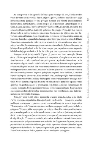 Ao transportar as imagens da infância para o campo da arte, Flávio muitas vezes levanta do chão ou da mesa, objetos, gestos, rastros e movimentos cuja horizontalidade parecia ser sua posição natural. Na parede encontraremos misturadas a outras figuras, a sola dos pés (Meu peso ideal, 1989) (Figura 6), a terra, a água, a pista de carros (Transport École, 2006), (Figura 7), a batalha dos soldados (Esquema tático II, 2006), as figuras de coleção (Peixe, 1993), o campo demarcado, e outros. Inúmeras imagens e fragmentos de objetos que nos devolvem a consciência da força primeira que rege nosso corpo e, muitas vezes, as bases do desenho: a gravidade. Seria possível dizer que nos desenhos de Flávio Gonçalves a evocação do chão e a presença da terra nos remeteriam a um contato primordial de nosso corpo com o mundo circundante. Foi no chão, com os brinquedos espalhados à volta de nosso corpo, que experimentamos as possibilidades do jogo simbólico. E foi do chão que nos erguemos vitoriosamente. Transport-école (2003-2006) (Figura 7) parece um bom exemplo. Nessa obra, o limite quadrangular do suporte é rompido e vê-se pistas de autorama abandonarem o chão espalhando-se pela parede. Aqui não são mais os carrinhos que trafegam em alta velocidade, mas sim nosso olhar que segue o percurso construído pelo artista. Por vezes estacionamos ao encontrar novas formas ou surpreendentes materiais. Andamos mais um pouco e a visão torna-se turva devido ao embaçamento imposto pelo papel vegetal. Feito neblina, o suposto suporte pula para a frente e a pista muda de tom. A sobreposição de transparências reais impossibilita a nitidez da imagem, criando espessuras e um vago mistério. Nosso olhar não apenas transita em movimentos paralelos à parede mas quer ver em profundidade. O artista joga com todas as nossas expectativas de sentido e direção. Como paisagem vista de topo ou apresentação diagramática o desenho nos faz refletir sobre nossos hábitos e as coordenadas que determinam nossa percepção de espaço. Transport-école (2003-2006) apresenta-se como uma charada e já no título Flávio provoca o espectador. Transport-école, em francês, — transporte-escolar na língua portuguesa — parece evocar, por semelhança de sons, o imperativo “Transporte e cole!”, remetendo-nos, também, ao papier-collé: papel colado = colagem. Técnica, aliás, empregada na própria obra. Em outro sentido, transporte-escolar poderia ser relacionado tanto com a infância (o transporte coletivo), com o brinquedo (autorama-carro-transporte), quanto com o transporte de significação (Transporte e cole!). Mas existe ainda um outro deslocamento: o transporte do próprio documento de trabalho. Os fragmentos de pista, outrora pertencentes ao universo lúdico e, por vezes, representados no desenho, agora migram dos bastidores, do espaço de produção, para incorporarem-se à obra. Transformam-se em linhas, retas e curvas, ou simples retângulos.