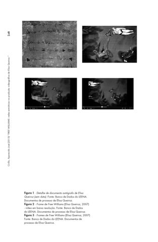 Figura 1 ∙ Detalhe de documento autógrafo de Elisa Queiroz (sem data). Fonte: Banco de Dados do LEENA. Documentos de processo de Elisa Queiroz. Figura 2 ∙ Frame de Free Williams (Elisa Queiroz, 2007) - vídeo em baixa resolução. Fonte: Banco de Dados do LEENA. Documentos de processo de Elisa Queiroz. Figura 3 ∙ Frames de Free Williams (Elisa Queiroz, 2007) Fonte: Banco de Dados do LEENA. Documentos de processo de Elisa Queiroz.