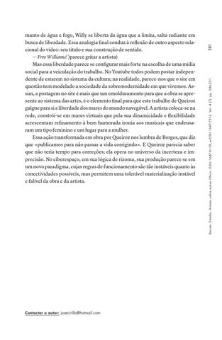 manto de água e fogo, Willy se liberta da água que a limita, salta radiante em busca de liberdade. Essa analogia final conduz à reflexão de outro aspecto relacional do vídeo: seu título e sua construção de sentido. — Free Williams! )parece gritar a artista) Mas essa liberdade parece se configurar mais forte na escolha de uma mídia social para a veiculação do trabalho. No Youtube todos podem postar independente de estarem no sistema da cultura; na realidade, parece-nos que o site em questão tem modelado a sociedade da sobremodernidade em que vivemos. Assim, a postagem no site é mais que um emolduramento para que a obra se apresente ao sistema das artes, é o elemento final para que este trabalho de Queiroz galgue para si a liberdade dos mares do mundo navegável. A artista coloca-se na rede, constrói-se em mares virtuais que pela sua dinamicidade e flexibilidade acrescentam refinamento à bem humorada ironia aos musicais que endeusaram um tipo feminino e um lugar para a mulher. Essa ação transformada em obra por Queiroz nos lembra de Borges, que diz que «publicamos para não passar a vida corrigindo». E Queiroz parecia saber que não teria tempo para correções; ela opera no universo da incerteza e imprecisão. No ciberespaço, em sua lógica de rizoma, sua produção parece se em um novo paradigma, cujas regras de funcionamento são tão instáveis quanto às conectividades possíveis, mas permitem uma tolerável materialização instável e falível da obra e da artista.