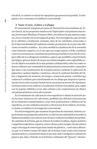 El conocimiento temprano por parte de Furriols del estructuralismo de Torres García, de las propuestas matéricas de Tápies junto a sus primeras elecciones afectivas por Mondrian, Fontana o Miró, son indicios de que materia y espació, son ya el núcleo de la investigación propia. Una investigación, que necesita de la reflexión y meditación constante, lejos de las veleidades comerciales o de la baja mundanidad del ambiente artístico provinciano de un país aún deficiente en muchos sentidos… En cierta medida la consideración de la anomalía como elemento negativo, en el caso que nos ocupa, quizás se deba considerar como esa circunstancia, extrañamente positiva que facilita la creación de un espacio libre de la contingencia mediática, espacio que posibilita a Joan Furriols, investigar y generar dentro de un proceso ininterrumpido, unas esplendidas series de objetos rescatados de la más próxima cotidianeidad, sobre los cuales se hacen evidentes una continuidad de planteamientos estructurales y espaciales que junto a una trasmutación de la propia materia, mediante la aplicación de pigmentos o patinas líquidas o matéricas, elevan la condición humilde del objeto a fragmentos de memoria, de tiempo, a manera de poesía o símbolos que conjuran lo cotidiano para transformarlo en esa chispa que despierta el pensamiento: En los años sesenta Furriols inicia encuentra un terreno de experimentación personal en las maderas y las planchas de hierro horadadas, para seguir con los papeles doblados en los años ochenta y las composiciones de objetos con patinas pictóricas en los años noventa. En el tratamiento de cada una de estas superficies u objetos la atención hacia las leyes intrínsecas de cada forma, posibilita una delicada estructuración de los elementos transformadores, sean estos perforaciones o dobleces de las superficies, en esta cuidadosa atención y observación de los objetos y la forma, es donde se establece la investigación como método. En esta investigación, que mantiene las premisas de estructura, materia y espacio desde unas propuestas reductivas, se adivina una voluntad de trascender la bidimensionalidad, casi como un acto de hacer evidente la realidad más profunda i autentica de la forma, que no el deseo de realizar escultura, al girar, positivar o negativizar superficies, espacios, vacíos o llenos, parte siempre, de una relativa carga o descarga de materia que tiene mucho de pictórica… con la única diferencia que es el mismo cuerpo del objeto (de la forma) el que actúa como materia transformadora y constatación final en una muy sutil e inteligente confusión de géneros que sitúa a Furriols en el territorio continuado del “generar”, desmar-
