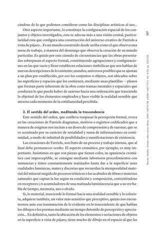 cándose de lo que podemos considerar como las disciplinas artísticas al uso… Otro aspecto importante, lo constituye la configuración espacial de los conjuntos y objetos investigados, esta se adecua más a una visión cenital, particularidad esta que configura una construcción del universo creativo de Furriols a vista de pájaro… Es un mundo construido desde arriba como el que observa una mesa de trabajo, a manera del demiurgo que observa la creación de su mundo particular. Es quizás por este cúmulo de circunstancias que las obras presentadas sobrepasan el aspecto formal, constituyendo agrupaciones y configuraciones en las que vacío y lleno establecen relaciones simbólicas que nos hablan de nuevas descripciones de lo existente; mundos, universos posibles que se ajustan a un plan pre-establecido, por eso los conjuntos u objetos, son ubicados sobre las superficies y espacios que los contienen, mediante unas plantillas — planos que forman parte inherente de la obra como tramas mentales y espaciales que conducen lo que pueda haber de azaroso hacia una ordenación que trasciende lo objetual de los elementos empleados y hace visible la realidad sensible que atesora cada momento de la cotidianeidad percibida.
