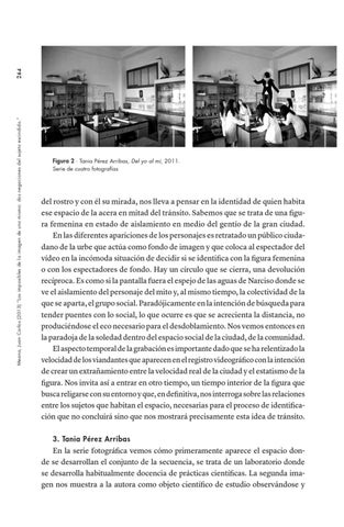 del rostro y con él su mirada, nos lleva a pensar en la identidad de quien habita ese espacio de la acera en mitad del tránsito. Sabemos que se trata de una figura femenina en estado de aislamiento en medio del gentío de la gran ciudad. En las diferentes apariciones de los personajes es retratado un público ciudadano de la urbe que actúa como fondo de imagen y que coloca al espectador del vídeo en la incómoda situación de decidir si se identifica con la figura femenina o con los espectadores de fondo. Hay un círculo que se cierra, una devolución recíproca. Es como si la pantalla fuera el espejo de las aguas de Narciso donde se ve el aislamiento del personaje del mito y, al mismo tiempo, la colectividad de la que se aparta, el grupo social. Paradójicamente en la intención de búsqueda para tender puentes con lo social, lo que ocurre es que se acrecienta la distancia, no produciéndose el eco necesario para el desdoblamiento. Nos vemos entonces en la paradoja de la soledad dentro del espacio social de la ciudad, de la comunidad. El aspecto temporal de la grabación es importante dado que se ha relentizado la velocidad de los viandantes que aparecen en el registro videográfico con la intención de crear un extrañamiento entre la velocidad real de la ciudad y el estatismo de la figura. Nos invita así a entrar en otro tiempo, un tiempo interior de la figura que busca religarse con su entorno y que, en definitiva, nos interroga sobre las relaciones entre los sujetos que habitan el espacio, necesarias para el proceso de identificación que no concluirá sino que nos mostrará precisamente esta idea de tránsito. 3. Tania Pérez Arribas