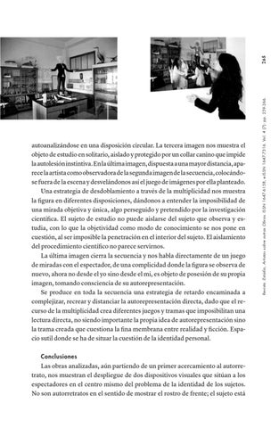 autoanalizándose en una disposición circular. La tercera imagen nos muestra el objeto de estudio en solitario, aislado y protegido por un collar canino que impide la autolesión instintiva. En la última imagen, dispuesta a una mayor distancia, aparece la artista como observadora de la segunda imagen de la secuencia, colocándose fuera de la escena y desvelándonos así el juego de imágenes por ella planteado. Una estrategia de desdoblamiento a través de la multiplicidad nos muestra la figura en diferentes disposiciones, dándonos a entender la imposibilidad de una mirada objetiva y única, algo perseguido y pretendido por la investigación científica. El sujeto de estudio no puede aislarse del sujeto que observa y estudia, con lo que la objetividad como modo de conocimiento se nos pone en cuestión, al ser imposible la penetración en el interior del sujeto. El aislamiento del procedimiento científico no parece servirnos. La última imagen cierra la secuencia y nos habla directamente de un juego de miradas con el espectador, de una complicidad donde la figura se observa de nuevo, ahora no desde el yo sino desde el mi, es objeto de posesión de su propia imagen, tomando consciencia de su autorepresentación. Se produce en toda la secuencia una estrategia de retardo encaminada a complejizar, recrear y distanciar la autorepresentación directa, dado que el recurso de la multiplicidad crea diferentes juegos y tramas que imposibilitan una lectura directa, no siendo importante la propia idea de autorepresentación sino la trama creada que cuestiona la fina membrana entre realidad y ficción. Espacio sutil donde se ha de situar la cuestión de la identidad personal.