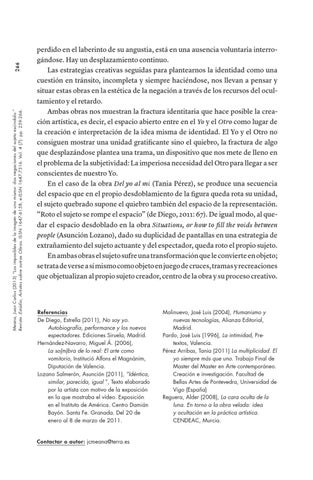 perdido en el laberinto de su angustia, está en una ausencia voluntaria interrogándose. Hay un desplazamiento continuo. Las estrategias creativas seguidas para plantearnos la identidad como una cuestión en tránsito, incompleta y siempre haciéndose, nos llevan a pensar y situar estas obras en la estética de la negación a través de los recursos del ocultamiento y el retardo. Ambas obras nos muestran la fractura identitaria que hace posible la creación artística, es decir, el espacio abierto entre en el Yo y el Otro como lugar de la creación e interpretación de la idea misma de identidad. El Yo y el Otro no consiguen mostrar una unidad gratificante sino el quiebro, la fractura de algo que desplazándose plantea una trama, un dispositivo que nos mete de lleno en el problema de la subjetividad: La imperiosa necesidad del Otro para llegar a ser conscientes de nuestro Yo. En el caso de la obra Del yo al mi (Tania Pérez), se produce una secuencia del espacio que en el propio desdoblamiento de la figura queda rota su unidad, el sujeto quebrado supone el quiebro también del espacio de la representación. “Roto el sujeto se rompe el espacio” (de Diego, 2011: 67). De igual modo, al quedar el espacio desdoblado en la obra Situations, or how to fill the voids between people (Asunción Lozano), dado su duplicidad de pantallas en una estrategia de extrañamiento del sujeto actuante y del espectador, queda roto el propio sujeto. En ambas obras el sujeto sufre una transformación que le convierte en objeto; se trata de verse a sí mismo como objeto en juego de cruces, tramas y recreaciones que objetualizan al propio sujeto creador, centro de la obra y su proceso creativo.
