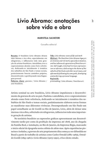 Salvatori, Maristela (2013) “Lívio Abramo: anotações sobre vida e obra.” Revista :Estúdio, Artistas sobre outras Obras. ISSN 1647-6158, e-ISSN 1647-7316. Vol. 4 (7): pp. 267-271.