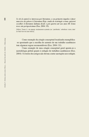 Como exemplo da citação conceptual localizada exemplifica-se apontando que a escolha do assunto de um trabalho académico tem algumas regras recomendáveis (Eco, 2004: 33). Como exemplo de uma citação conceptual geral aponta-se a metodologia global quanto à redação de trabalhos académicos (Eco, 2004). Os textos dos artigos não devem conter anotações nos rodapés.