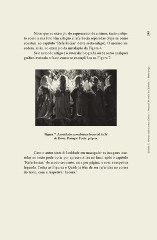 Caso o autor sinta dificuldade em manipular as imagens inseridas no texto pode optar por apresentá-las no final, após o capítulo ‘Referências,’ de modo sequente, uma por página, e com a respetiva legenda. Todas as Figuras e Quadros têm de ser referidas no correr do texto, com a respetiva ‘âncora.’