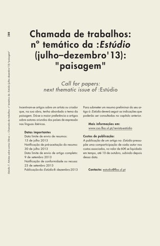 Chamada de trabalhos: nº temático da :Estúdio (julho–dezembro'13): "paisagem" Call for papers: next thematic issue of :Estúdio Incentivam-se artigos sobre um artista ou criador que, na sua obra, tenha abordado o tema da paisagem. Dá-se a maior preferência a artigos sobre autores oriundos dos países de expressão nas línguas ibéricas. Datas importantes Data limite de envio de resumos: 15 de julho 2013 Notificação de pré-aceitação do resumo: 30 de julho 2013 Data limite de envio de artigo completo: 9 de setembro 2013 Notificação de conformidade ou recusa: 23 de setembro 2013 Publicação da :Estúdio 8: dezembro 2013