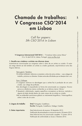 V Congresso Internacional CSO’2014 — “Criadores Sobre outras Obras” 10 a 16 abril 2014, Lisboa, Portugal. www.cso.fba.ul.pt 1. Desafio aos criadores e artistas nas diversas áreas Incentivam-se comunicações ao congresso sobre a obra de um artista ou criador. O autor do artigo deverá ser ele também um artista ou criador graduado, exprimindo-se numa das línguas ibéricas. Tema geral / Temática: Os artistas conhecem, admiram e comentam a obra de outros artistas — seus colegas de trabalho, próximos ou distantes. Existem entre eles afinidades que se desejam dar a ver. Foco / Enfoque: O congresso centra-se na abordagem que o artista faz à produção de um outro criador, seu colega de profissão. Esta abordagem é enquadrada na forma de comunicação ao congresso. Encorajam-se as referências menos conhecidas ou as leituras menos ‘óbvias.’ É desejável a delimitação: aspetos específicos conceptuais ou técnicos, restrição a alguma (s) da(s) obra(s) dentro do vasto corpus de um artista ou criador. Não se pretendem panoramas globais ou meramente biográficos / historiográficos sobre a obra de um autor. 2. Línguas de trabalho Oral: Português; Castelhano. Escrito: Português; Castelhano; Galego; Catalão. 3. Datas importantes Data limite de envio de resumos: 30 dezembro 2013. Notificação de pré-aceitação ou recusa do resumo: 20 janeiro 2014. Data limite de envio da comunicação completa: 13 janeiro 2014.