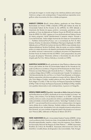 NEIDE MARCONDES (Brasil), Universidade Estadual Paulista (UNESP). Artista visual e professora titular. Doutora em Artes, Universidade de São Paulo (USP). Publicações especializadas, resenhas, artigos, anais de congressos, livros. Membro da Associação Nacional de Pesquisa em Artes Plásticas — ANPAP, Associação Brasileira de Críticos de Arte-ABCA, Associação Internacional de Críticos de Arte-AICA, Conselho Museu da Emigração e das Comunidades, Fafe, Portugal.