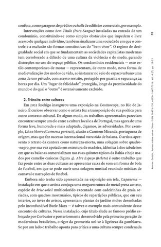 confusa, como garagens de prédios ou halls de edifícios comerciais, por exemplo. Intervenções como Sem Título (Puro Sangue) instaladas na entrada de um condomínio, constituindo-se como simples obstáculos que impedem o livre acesso de qualquer indivíduo, também sinalizam uma sociedade em que o controle e a exclusão são formas constitutivas do “bem viver”. O regime de desigualdade social em que se fundamentam as sociedades capitalistas modernas tem corroborado a difusão de uma cultura da violência e do medo, gerando distorções no uso do espaço público. Os condomínios residenciais — esse estilo contemporâneo de morar — representam, de outro modo, nova forma de medievalização dos modos de vida, ao instaurar no seio do espaço urbano uma zona de uso privado, com acesso restrito, protegido por guarita e segurança 24 horas por dia. Um “lugar de felicidade” protegida, longe da promiscuidade do mundo e do qual o “outro” é ostensivamente excluído.