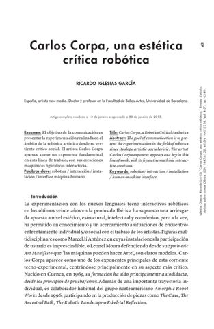 Iglesias García, Ricardo (2013) “Carlos Corpa, una estética crítica robótica.” Revista :Estúdio, Artistas sobre outras Obras. ISSN 1647-6158, e-ISSN 1647-7316. Vol. 4 (7): pp. 43-49.