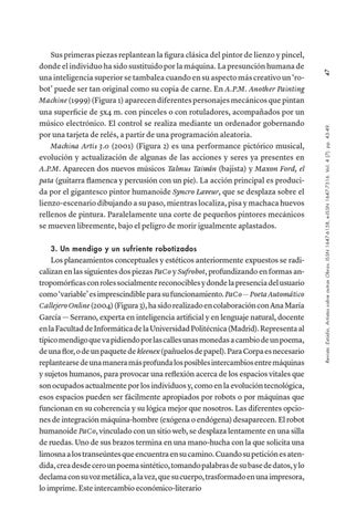 Sus primeras piezas replantean la figura clásica del pintor de lienzo y pincel, donde el individuo ha sido sustituido por la máquina. La presunción humana de una inteligencia superior se tambalea cuando en su aspecto más creativo un ‘robot’ puede ser tan original como su copia de carne. En A.P.M. Another Painting Machine (1999) (Figura 1) aparecen diferentes personajes mecánicos que pintan una superficie de 5x4 m. con pinceles o con rotuladores, acompañados por un músico electrónico. El control se realiza mediante un ordenador gobernando por una tarjeta de relés, a partir de una programación aleatoria. Machina Artis 3.0 (2001) (Figura 2) es una performance pictórico musical, evolución y actualización de algunas de las acciones y seres ya presentes en A.P.M. Aparecen dos nuevos músicos Talmus Taiwán (bajista) y Maxon Ford, el pata (guitarra flamenca y percusión con un pie). La acción principal es producida por el gigantesco pintor humanoide Syncro Laveur, que se desplaza sobre el lienzo-escenario dibujando a su paso, mientras localiza, pisa y machaca huevos rellenos de pintura. Paralelamente una corte de pequeños pintores mecánicos se mueven libremente, bajo el peligro de morir igualmente aplastados.