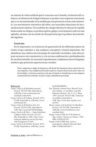 Referencias Corpa, Carlos (s.d) Manifiesto personal. [Consult. 2013-01-08]. Disponible en <URL:http://www.carloscorpa.net/ manifiesto/index.html> Corpa, Carlos (s.d) Trabajos. [Consult. 201301-08]. Disponible en <URL:http://www. carloscorpa.net> Corpa, Carlos (s.d) Machina Artis 3.0. [Consult. 2013-01-08]. Disponible en <URL: http://youtu.be/AI5Nx9y0Jpg> Corpa, Carlos (s.d) PaCo — Poeta Automático Callejero Online. [Consult. 2013-0108]. Disponible en <URL:< http://www. fundacion.telefonica.com/es/at/vida/ vida10/paginas/v7.html> Corpa, Carlos (s.d) Sufrobot. [Consult. 201301-08]. Disponible en <URL:http://youtu.