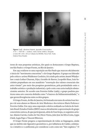 torno de suas propostas artísticas, dos quais se destacaram o Grupo Ruptura, em São Paulo e o Grupo Frente, no Rio de Janeiro. Em 1952 realizou-se uma exposição em São Paulo que marcou oficialmente o início do “movimento concretista” e do Grupo Ruptura. O grupo era liderado pelo crítico e artista Waldemar Cordeiro, foi criado pelo artista Anatol Wladyslaw e mais Lothar Charoux, Féjer, Geraldo de Barros, Leopoldo Haar, Luiz Saciolotto propunham em seu manifesto “renovação dos valores essenciais das artes visuais”, por meio das pesquisas geométricas, pela proximidade entre o trabalho artístico e produção industrial, e pelo corte com certa tradição abstracionista anterior. De acordo com Ferreira Gullar (1985), o grupo paulista praticava uma arte concreta definida como “o barroco da bidimensionalidade,” o que gerou divergências entre os dois grupos. O Grupo Frente, do Rio de Janeiro, foi formado em torno do artista Ivan Serpa e de seus alunos no Museu de Arte Moderna e dos teóricos Mario Pedrosa e Ferreira Gullar. Em 1953, uma exposição coletiva realizada na Galeria do Instituto Brasil-Estados Unidos (IBEU) marca oficialmente a apresentação do grupo concretista carioca, de que participaram, além de Ivan Serpa, os seguintes artistas: Aluisio Carvão, Carlos do Val, Décio Vieira, João José da Silva Costa, Lygia Clark, Lygia Pape e Vincent Ibberson. O Grupo Frente pregava a experimentação de todas as linguagens, ainda que no âmbito não-figurativo geométrico e, por influência de Calder, enfatizava o intuitivo e o ambiental, por considerar a arte como um “fato orgânico.” O