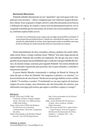 http://www.nararoesler.com.br/artistas/ abraham-palatnik Salles, Cecilia Almeida (2010) Arquivos e Criação: arte e curadoria. Vinhedo; Editora Horizonte. Silva, Júlio Cesar da (2012) In: Atelier Embira — Lugar Processo. Anais do Congresso Internacional da Associação de Críticos Genéticos — X Edição; PUC — Rio Grande do Sul.