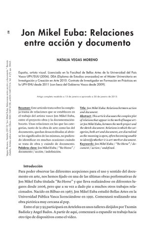 58 Vegas Moreno, Natalia (2013) “Jon Mikel Euba: Relaciones entre acción y documento.” Revista :Estúdio, Artistas sobre outras Obras. ISSN 1647-6158, e-ISSN 1647-7316. Vol. 4 (7): pp. 58-63.