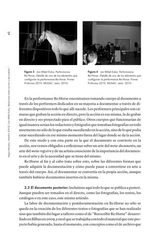 En la performance Re:Horse encontramos tomando cuerpo al documento a través de los performers dedicados en su mayoría a documentar a través de diferentes dispositivos todo lo que allí sucede. Los performers principales son cámaras que graban la acción en directo, pero la acción es esa misma, la de grabar en directo y ser proyectado para el público. Otros cuerpos que funcionarían de igual manera serían los redactores y fotógrafos que tomaban fotografías en todo moemento no sólo de lo que estaba sucediendo en la acción, sino de lo que podía estar sucediendo en ese mismo momento fuera del lugar donde se da la acción. De este modo y con esta parte en la que el documento se convierte en la acción, nos vemos obligados a reflexionar sobre un arte del meta-documento, un arte del meta-registro y de un artista consciente de la importancia del documento en el arte y de la necesidad que se tiene del mismo. Re:Horse al fin y al cabo trata sobre esto, sobre las diferentes formas que puede adquirir la documentación y cómo puede pasar a convertirse en arte a través del cuerpo. Así, el documentar se convertía en la propia acción, aunque también hubiese documentos insertos en la misma. 2.3 El documento posterior: Incluimos aquí todo lo que se publica a posteri. Aunque pueden ser tomados en el directo, como las fotografías, los textos, los catálogos o en este caso, este mismo artículo. La labor de documentación y postdocumentación en Re:Horse no sólo se queda en la creación de los diferentes textos o fotografías que se han realizado sino que también dió lugar a talleres como el de “Reescribir Re:Horse” desarrollado en Bilbao en 2009, y en el que se trabajaba con todo el material que este proyecto había generado, hasta el momento, con conceptos como el de archivo que