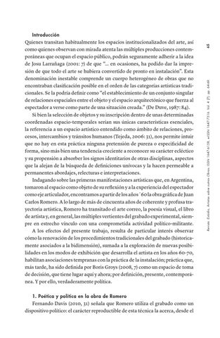 Quienes transitan habitualmente los espacios institucionalizados del arte, así como quienes observan con mirada atenta las múltiples producciones contemporáneas que ocupan el espacio público, podrán seguramente adherir a la idea de Josu Larrañaga (2001: 7) de que “… en ocasiones, ha podido dar la impresión de que todo el arte se hubiera convertido de pronto en instalación”. Esta denominación inestable comprende un cuerpo heterogéneo de obras que no encontraban clasificación posible en el orden de las categorías artísticas tradicionales. Se la podría definir como “el establecimiento de un conjunto singular de relaciones espaciales entre el objeto y el espacio arquitectónico que fuerza al espectador a verse como parte de una situación creada.” (De Duve, 1987: 84). Si bien la selección de objetos y su inscripción dentro de unas determinadas coordenadas espacio-temporales serían sus únicas características esenciales, la referencia a un espacio artístico entendido como ámbito de relaciones, procesos, intercambios y tránsitos humanos (Tejeda, 2006: 31), nos permite intuir que no hay en esta práctica ninguna pretensión de pureza o especificidad de forma, sino más bien una tendencia creciente a reconocer su carácter ecléctico y su propensión a absorber los signos identitarios de otras disciplinas, aspectos que la alejan de la búsqueda de definiciones unívocas y la hacen permeable a permanentes abordajes, relecturas e interpretaciones. Indagando sobre las primeras manifestaciones artísticas que, en Argentina, tomaron al espacio como objeto de su reflexión y a la experiencia del espectador como eje articulador, encontramos a partir de los años ´60 la obra gráfica de Juan Carlos Romero. A lo largo de más de cincuenta años de coherente y profusa trayectoria artística, Romero ha transitado el arte correo, la poesía visual, el libro de artista y, en general, las múltiples vertientes del grabado experimental, siempre en estrecho vínculo con una comprometida actividad político-militante. A los efectos del presente trabajo, resulta de particular interés observar cómo la renovación de los procedimientos tradicionales del grabado (historicamente asociados a la bidimensión), sumada a la exploración de nuevas posibilidades en los modos de exhibición que desarrolla el artista en los años 60-70, habilitan asociaciones tempranas con la práctica de la instalación; práctica que, más tarde, ha sido definida por Boris Groys (2008, 7) como un espacio de toma de decisión, que tiene lugar aquí y ahora; por definición, presente, contemporánea. Y por ello, verdaderamente política.