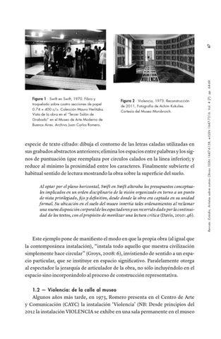 especie de texto cifrado: dibuja el contorno de las letras caladas utilizadas en sus grabados abstractos anteriores; elimina los espacios entre palabras y los signos de puntuación (que reemplaza por circulos calados en la línea inferior); y reduce al mínimo la proximidad entre los caracteres. Finalmente subvierte el habitual sentido de lectura mostrando la obra sobre la superficie del suelo. Al optar por el plano horizontal, Swift en Swift alteraba los presupuestos conceptuales implicados en un orden disciplinario de la visión organizado en torno a un punto de vista privilegiado, fijo y definitivo, desde donde la obra era captada en su unidad formal. Su ubicación en el suelo del museo invertía tales ordenamientos al reclamar una nueva disposición corporal de los espectadores y un recorrido dado por la continuidad de los textos, con el propósito de movilizar una lectura crítica (Davis, 2010: 46).