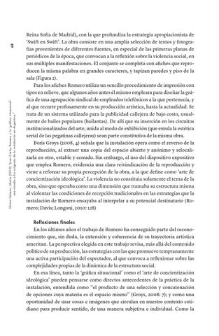 Reina Sofía de Madrid), con la que profundiza la estrategia apropiacionista de ‘Swift en Swift’. La obra consiste en una amplia selección de textos y fotografías provenientes de diferentes fuentes, en especial de las primeras planas de periódicos de la época, que convocan a la reflexión sobre la violencia social, en sus múltiples manifestaciones. El conjunto se completa con afiches que reproducen la misma palabra en grandes caracteres, y tapizan paredes y piso de la sala (Figura 2). Para los afiches Romero utiliza un sencillo procedimiento de impresión con tipos en relieve, que algunos años antes él mismo empleara para diseñar la gráfica de una agrupación sindical de empleados telefónicos a la que pertenecía, y al que recurre profusamente en su producción artística, hasta la actualidad. Se trata de un sistema utilizado para la publicidad callejera de bajo costo, usualmente de bailes populares (bailantas). De allí que su inserción en los circuitos institucionalizados del arte, unida al modo de exhibición (que emula la estética serial de las pegatinas callejeras) sean parte constitutiva de la misma obra. Boris Groys (2008, 4) señala que la instalación opera como el reverso de la reproducción, al extraer una copia del espacio abierto y anónimo y relocalizarla en otro, estable y cerrado. Sin embargo, el uso del dispositivo expositivo que emplea Romero, evidencia una clara reivindicación de la reproducción y viene a reforzar su propia percepción de la obra, a la que define como ‘arte de concientización ideológica’. La violencia no constituia solamente el tema de la obra, sino que operaba como una dimensión que tramaba su estructura misma al violentar las condiciones de recepción tradicionales en las estrategias que la instalación de Romero ensayaba al interpelar a su potencial destinatario (Romero; Davis; Longoni, 2010: 128) Reflexiones finales