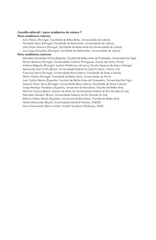 Conselho editorial / pares académicos do número 7 Pares académicos internos: Artur Ramos (Portugal, Faculdade de Belas-Artes, Universidade de Lisboa). Fernanda Maio (Portugal, Faculdade de Belas-Artes, Universidade de Lisboa). João Paulo Queiroz (Portugal, Faculdade de Belas-Artes da Universidade de Lisboa). Luís Jorge Gonçalves (Portugal, Faculdade de Belas-Artes, Universidade de Lisboa). Pares académicos externos: Almudena Fernández Fariña (Espanha, Facultad de Bellas Artes de Pontevedra, Universidad de Vigo). Álvaro Barbosa (Portugal, Universidade Católica Portuguesa, Escola das Artes, Porto). António Delgado (Portugal, Instituto Politécnico de Leiria, Escola Superior de Artes e Design). Aparecido José Cirillo (Brasil, Universidade Federal do Espírito Santo, Vitória, ES). Francisco Paiva (Portugal, Universidade Beira Interior, Faculdade de Artes e Letras). Heitor Alvelos (Portugal, Faculdade de Belas Artes, Universidade do Porto). Juan Carlos Meana (Espanha, Facultad de Bellas Artes de Pontevedra, Universidad de Vigo). Joaquim Paulo Serra (Portugal, Universidade Beira Interior, Faculdade de Artes e Letras). Josep Montoya Hortelano (Espanha, Universitat de Barcelona, Facultat de Belles Arts). Marilice Corona (Brasil, Instituto de Artes da Universidade Federal do Rio Grande do Sul). Maristela Salvatori (Brasil, Universidade Federal do Rio Grande do Sul). Mònica Febrer Martín (Espanha, Universitat de Barcelona, Facultat de Belles Arts). Neide Marcondes (Brasil, Universidade Estadual Paulista, UNESP). Nuno Sacramento (Reino Unido, Scottish Sculpture Workshop, SSW).