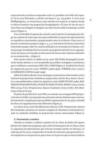 representación con líneas ortogonales entre sí y paralelas a los lados del soporte. En la serie ESCuadra, se divide con líneas a 45 y 135 grados. Y, en la serie HEMipitagórica, se trazan líneas cuya relación con respecto al soporte donde se ubican mantiene una proporción hemipitagórica. El cruce de tres de sus líneas forma un triángulo rectángulo cuyo lado menor mide la mitad que su lado mayor (Figura 1). Una vez dividido el espacio de acuerdo a esto criterios, la estrategia para elegir un conjunto de trazos que sirva para subdividir el espacio de representación en superficies relacionadas y proporcionales entre sí es diverso. Unas veces, el proceso constructivo propone elegir 2, 3, 4, 5 o más líneas de forma consecutiva y haciendo siempre valer los criterios utilizados en su trazado y los límites a evitar para que el resultado final sea acorde a la propuesta del autor: la no superposición de líneas en el trazado, la alternancia de líneas entre sistemas utilizados en su construcción,… (Figura 2). Este mismo criterio se utilizó en las series DR (Doble Rectángulo) (20062007) donde además se creó un plantilla de posibles rectángulos concéntricos que se atribuían a estructuras ORT, ESC o HEM (Figura 3). También fue fuente de inspiración para las series TONDO (1998-1999), VERBIER (2001-2003) y CUADRADOS CURVAS (1998-1999). Julián Gil utiliza además otras estrategias constructivas relacionadas con los sistemas de proporciones dinámicas: proporciones ráiz de dos y áureas. En torno a esta problemática realiza las siguientes series: RAÍZ DE DOS (1985), RAÍZDEDOS FRAGMENTADO, PLIEGUES RAÍZ DE DOS, ÁUREO (2004-2006), PHI (2004), P.A.C (Proporciones Áureas Cuadrado) (2005-2006) y RA (Relaciones Áureas) (2004). El punto de partida de la serie PHI, es construir un rectángulo PHI (proporción áurea (1.618)) e incorporarle una estructura interna dinámica que sea lo suficientemente compleja para que posibilite la generación de una gran variedad de obras con organizaciones muy diferentes (Figura 4). Las obras de las series RA (Relaciones Áureas) y PAC (Proporciones Áureas del Cuadrado), muestran un sistema complejo de elementos estructurales basado en cuadrados divididos en proporciones áureas relacionadas (Figura 5).