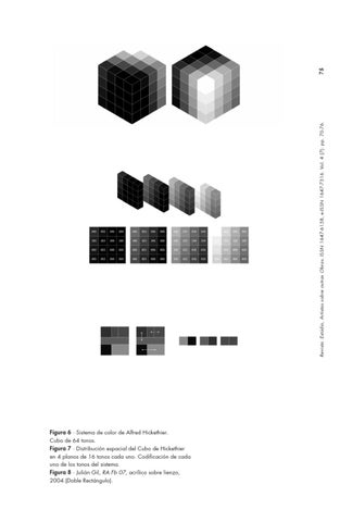 Figura 6 ∙ Sistema de color de Alfred Hickethier. Cubo de 64 tonos. Figura 7 ∙ Distribución espacial del Cubo de Hickethier en 4 planos de 16 tonos cada uno. Codificación de cada uno de los tonos del sistema. Figura 8 ∙ Julián Gil, RA Fb 07, acrílico sobre lienzo, 2004.(Doble Rectángulo).