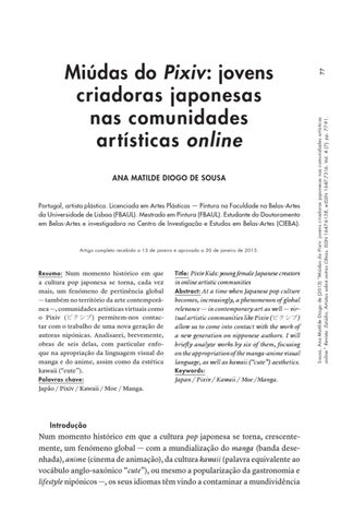 77 Sousa, Ana Matilde Diogo de (2013) “Miúdas do Pixiv: jovens criadoras japonesas nas comunidades artísticas online.” Revista :Estúdio, Artistas sobre outras Obras. ISSN 1647-6158, e-ISSN 1647-7316. Vol. 4 (7): pp. 77-91.