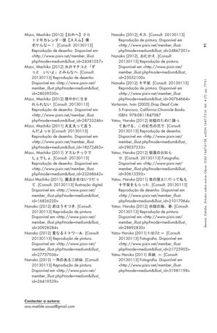 Nanako (2012),キス. [Consult. 20130113] Reprodução de pintura. Disponível em <http://www.pixiv.net/member_illust. php?mode=medium&illust_id=24867301> Nanako (2012), おむかえ. [Consult. 20130113] Reprodução de pintura. Disponível em <http://www.pixiv.net/ member_illust.php?mode=medium&illust_ id=25032100> Nanako (2012) 十字架. [Consult. 20130113] Reprodução de pintura. Disponível em <http://www.pixiv.net/member_illust. php?mode=medium&illust_id=30764664> Vartanian, Ivan (2005) Drop Dead Cute. S.Francisco, Califórnia:Chronicle Books. ISBN: 978-0811847087 Yatou, Haruka (2012) 地獄のために踊っ てあげる、この虹色の尻で. [Consult. 20130113] Reprodução de desenho. Disponível em <http://www.pixiv.net/ member_illust.php?mode=medium&illust_ id=29037233> Yatou, Haruka (2012) 個展のお知ら せ. [Consult. 20130113] Fotografia. Disponível em <http://www.pixiv.net/ member_illust.php?mode=medium&illust_ id=30613593> Yatou, Haruka (2011) 夜の屋上に行って私も 十字架をもらった. [Consult. 20130113] Reprodução de desenho. Disponível em <http://www.pixiv.net/member_illust. php?mode=medium&illust_id=21017064> Yatou, Haruka (2012) 地獄の海、春. [Consult. 20130113] Reprodução de pintura. Disponível em <http://www.pixiv.net/ member_illust.php?mode=medium&illust_ id=28892830> Yatou Haruka (2011)1は0と∞. [Consult. 20130113] Fotografia. Disponível em <http://www.pixiv.net/member_illust. php?mode=medium&illust_id=21725905> Yatou Haruka (2011) 茶碗. ∞. [Consult. 20130113] Fotografia. Disponível em <http://www.pixiv.net/member_illust. php?mode=medium&illust_id=31981198>