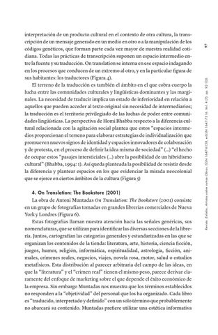 interpretación de un producto cultural en el contexto de otra cultura, la transcripción de un mensaje generado en un medio en otro o a la manipulación de los códigos genéticos, que forman parte cada vez mayor de nuestra realidad cotidiana. Todas las prácticas de transcripción suponen un espacio intermedio entre la fuente y su traducción. On translation se interna en ese espacio indagando en los procesos que conducen de un extremo al otro, y en la particular figura de sus habitantes: los traductores (Figura 4). El terreno de la traducción es también el ámbito en el que cobra cuerpo la lucha entre las comunidades culturales y lingüísticas dominantes y las marginales. La necesidad de traducir implica un estado de inferioridad en relación a aquellos que pueden acceder al texto original sin necesidad de intermediarios; la traducción es el territorio privilegiado de las luchas de poder entre comunidades lingüísticas. La perspectiva de Homi Bhabba respecto a la diferencia cultural relacionada con la agitación social plantea que estos “espacios intermedios proporcionan el terreno para elaborar estrategias de individualización que promueven nuevos signos de identidad y espacios innovadores de colaboración y de protesta, en el proceso de definir la idea misma de sociedad” (…) “el hecho de ocupar estos “pasajes intersticiales (…) abre la posibilidad de un hibridismo cultural” (Bhabba, 1994: 1). Así queda planteada la posibilidad de resistir desde la diferencia y plantear espacios en los que evidenciar la mirada neocolonial que se ejerce en ciertos ámbitos de la cultura (Figura 5)