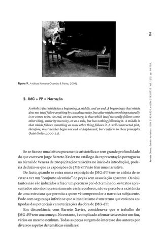 2. JMG + PP = Narração A whole is that which has a beginning, a middle, and an end. A beginning is that which does not itself follow anything by causal necessity, but after which something naturally is or comes to be. An end, on the contrary, is that which itself naturally follows some other thing, either by necessity, or as a rule, but has nothing following it. A middle is that which follows something as some other thing follows it. A well constructed plot, therefore, must neither begin nor end at haphazard, but conform to these principles (Aristóteles, 2000: 12).
