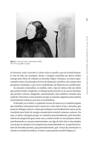 de desenhar, onde o desenho é o Outro onde se espelha o que de verdadeiramente tem de belo em si-própria. Assim, a imagem envolvida em afetos retidos emerge pelo efeito de reflexão no desenho-objeto. Portanto, os temas representados nunca são desenhos do foro da ilustração científica, são sempre uma perspetiva estetizada, e, por vezes, simbolizada, da Natureza (no sentido lato). As emoções (contraídas), ou melhor, todo o tipo de afetos, têm um efeito que poderá tender à implosão. A situação pode inverter-se no ato de desenhar que permite evitá-la, mitigando, exteriorizando, mas também evitando uma explosão. Desenhar é uma tentativa de que as emoções adquiram uma matéria sensivelmente estética e, por isso, reconciliadora. O desenho, ou o Outro, é o primeiro recetor do nosso eu e é também aquele que estabelece uma ponte entre o nosso eu e o dos outros. É ele, o desenho, que primeiro dialoga connosco. Antes que tenhamos um feedback dos outros, já ele constituiu uma fonte de energia comunicativa sensível connosco, autores. Ou seja, os afetos emergem porque se comunica processualmente, pelo desenho, através da imagem da qual, neste caso, a autora recebe os seus próprios afetos, transformando as censuras interiorizadas, em algo de belo. Isto é uma simples via em que as emoções se recompuseram, materializando-se. A experiência íntima do desenho permite, aqui particularmente, que a força da construção se oriente no sentido da estética. A meta é o pensamento sensível (Figura 1).