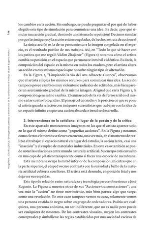 los cambios en la acción. Sin embargo, se puede preguntar el por qué de haber elegido este tipo de simulación para comunicar una idea. Es decir, ¿por qué simular una acción gradual, dentro de un sistema de repetición? Decimos simular porque las imágenes y la acción están congeladas, de hecho ¿se trata de acciones? La única acción es la de su pensamiento e la imagen congelada en el espacio, es el resultado poético de sus trabajos. Así, en “Todo lo que sé hacer con los patitos que me regaló Vádim Zhajárov” (Figura 1) notamos cómo el artista cambia su posición en el espacio que permanece inmóvil e idéntico. Es decir, la composición del espacio es la misma en todos los cuadros, pero el artista altera su acción en este mismo espacio que no sufre ningún tipo de alteración. En la Figura 2, “Limpiando la vía del Ave Albacete-Cuenca”, observamos que el artista emplea los mismos recursos para comunicar una idea. La acción tampoco posee cambios muy violentos o radicales de actitudes, más bien parece un acercamiento gradual de la misma imagen. Al igual que en la Figura 1, la composición general no cambia. El enmarcado de la vía de ferrocarril es el mismo en las cuatro fotografías. El paisaje, el encuadre y la posición en que se pone el artista guarda relación con imágenes surrealistas que trabajan con la idea de un espacio infinito en que una acción absurda e irreal se desarrolla. 3. Inter venciones en lo cotidiano: el lugar de la poesía y de la crítica