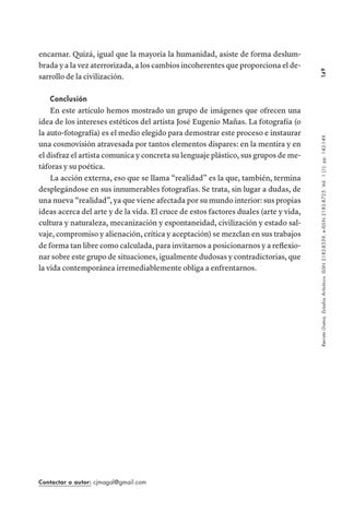 En este artículo hemos mostrado un grupo de imágenes que ofrecen una idea de los intereses estéticos del artista José Eugenio Mañas. La fotografía (o la auto-fotografía) es el medio elegido para demostrar este proceso e instaurar una cosmovisión atravesada por tantos elementos dispares: en la mentira y en el disfraz el artista comunica y concreta su lenguaje plástico, sus grupos de metáforas y su poética. La acción externa, eso que se llama “realidad” es la que, también, termina desplegándose en sus innumerables fotografías. Se trata, sin lugar a dudas, de una nueva “realidad”, ya que viene afectada por su mundo interior: sus propias ideas acerca del arte y de la vida. El cruce de estos factores duales (arte y vida, cultura y naturaleza, mecanización y espontaneidad, civilización y estado salvaje, compromiso y alienación, crítica y aceptación) se mezclan en sus trabajos de forma tan libre como calculada, para invitarnos a posicionarnos y a reflexionar sobre este grupo de situaciones, igualmente dudosas y contradictorias, que la vida contemporánea irremediablemente obliga a enfrentarnos.