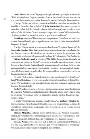 Lurdi Blauth, no texto “Impregnações pictóricas na produção artística de Clóvis Martins Costa,” apresenta a obra deste artista brasileiro, que introduz os processos da natureza, das areias, das marés, na materialização das suas obras. O artigo “Sobre narrativas, criando irrealidades: narrativa no trabalho de João Maria Gusmão e Pedro Paiva,” de João Pedro Leal, lança novas perspetivas sobre a obra de João Gusmão e Pedro Paiva (Portugal), que revisitam pensadores “não alinhados,” e suas propostas esquecidas como a “ciência das soluções imaginárias” ou, também, a ciência que “estuda o abismo.” Ana Hupe, no texto “Homenagem como processo,” inroduz a obra de Leonora de Barros (Brasil), que, em performance de 1975, revisita a assexualidade das peças de Segal. O artigo “Captación de lo tenue en la obra de Ann Veronique Janssens,” de Fernanda García e Pilar Soto, revela as pesquisas da artista, oriunda dos Países Baixos, em torno do infra leve, da experiência aguda do quotidiano e da captação do semisensorial, quase poderia dizer, do “infra mince” de Duchamp. Fátima Nader Cerqueira, no artigo “Marilá Dardot: pintura e fotografia na construção da paisagem digital,” apresenta a singular aproximação aos livros de uma artista, Marilá Dardot (Brasil), às suas afinidades eletivas. Os livros são aqui organizados como numa enciclopédia cromática, uma espécie de florilegium. Os livros tocam-se pelo olhar do seu possuidor e organizador, em torno de critérios inesperados. No texto “O desenho de Luísa Gonçalves como espelho sensível dos afetos,” Luís Filipe Rodrigues procura interpretar os trabalhos gráficos de Luísa Gonçalves (Portugal) através de uma dialética do sujeito e enquanto sujeito de um discurso de sexualidade. Carla Frazão apresenta as formas criativas, expansivas e quase fantásticas do ceramista António Lapa (Portugal), introduzindo-nos ao seu bestiário tátil, no seu artigo “O lúdico, o afeto e o imaginário infantil na obra de António Vasconcelos Lapa.” O artigo “Falsa ilusão de uma não interferência,” de Walmeri Ribeiro, debate o cinema de Ricardo Alves Jr (Brasil), autor com interseções do teatro onde se explora a expectativa e a separação entre o que se espera e o real, na esteira de Samuel Beckett. Cláudio Magalhães aborda a auto-representação de Antonio Mañas (Espanha), de vertente irónica e também política, no seu texto “Divergencias poéticas y reinvención de lo cotidiano en el trabajo de José Eugenio Mañas” Sissa de Assis debruça-se sobre a obra de Lúcia Gomes (Brasil) “Quando a arte não cala,” refletindo sobre as obras que evocam silêncios nos espaços repressivos, sejam eles políticos ou simplesmente urbanos.