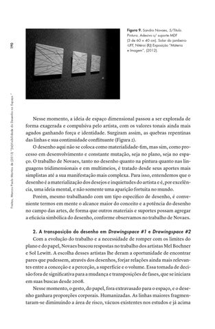 Nesse momento, a ideia de espaço dimensional passou a ser explorada de forma exagerada e compulsiva pelo artista, com os valores tonais ainda mais agudos ganhando força e identidade. Surgiram assim, as quebras repentinas das linhas e sua continuidade conflituante (Figura 2). O desenho aqui não se coloca como materialidade-fim, mas sim, como processo em desenvolvimento e constante mutação, seja no plano, seja no espaço. O trabalho de Novaes, tanto no desenho quanto na pintura quanto nas linguagens tridimensionais e em multimeios, é tratado desde seus aportes mais simplistas até a sua manifestação mais complexa. Para isso, entendemos que o desenho é a materialização dos desejos e inquietudes do artista e é, por excelência, uma ideia mental, e não somente uma aparição fortuita no mundo. Porém, mesmo trabalhando com um tipo específico de desenho, é conveniente termos em mente o alcance maior do conceito e a potência do desenho no campo das artes, de forma que outros materiais e suportes possam agregar a eficácia simbólica do desenho, conforme observamos no trabalho de Novaes. 2. A transposição do desenho em Drawingspace #1 e Drawingspace #2
