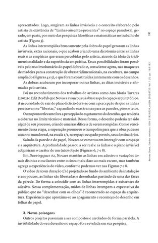 apresentados. Logo, surgiram as linhas invisíveis e o conceito elaborado pelo artista da existência de “Linhas-ausentes-presentes” no espaço paradoxal, gerado, em parte, por meio das pesquisas filosóficas e matemáticas no trabalho do artista (Figura 3). As linhas interrompidas bruscamente pela dobra do papel geraram as linhas invisíveis, extra racionais, o que acabou criando uma dicotomia entre as linhas reais e as empíricas que eram percebidas pelo artista, através da ideia de tridimensionalidade e da experiência em prática. Essas possibilidades foram possíveis pelo uso involuntário do papel dobrado e, consciente agora, nas maquetes de madeira para a construção de obras tridimensionais, na escultura, no campo ampliado (Figuras 4 e 5), e que foram constituídas juntamente com os desenhos. As dobras acabaram por incorporar outras linhas, as ditas invisíveis e afirmadas pelo artista. Foi no reconhecimento dos trabalhos de artistas como Ana Maria Tavares (2002) e Edit Derdyk que Novaes avançou suas buscas pelo espaço arquitetônico. A necessidade de sair do plano fictício dera-se com a percepção de que as linhas precisavam se “libertar,” expandindo suas tramas para as paredes, pisos e tetos. Outro ponto relevante fora a percepção do esgotamento do desenho, que tenderia a esbarrar no limite técnico e material. Dessa forma, o desenho poderia ter sido algoz de seu processo, criando amarras difíceis de serem rompidas. Com o vencimento dessa etapa, a superação promoveu o trampolim para que a obra pudesse atuar no mundo real, na escala 1/1, no espaço ocupado por nós, seus destinatários. Saindo da parede e do papel, Novaes se esmerou em interagir com o espaço e a arquitetura. A profundidade passou a ser real e as linhas e o plano invisível adquiriram o caráter de um (não) objeto (Figuras 6, 7 e 8). Em Drawingspace #2, Novaes mantêm as linhas em adesivo e variações tonais disintas e oscilantes entre o cinza mais claro ao mais escuro, mas também agrega a experiência do vídeo, conforme podemos ver nas Figuras 7 e 8. O vídeo de (com duração 3’) é projetado ao fundo do ambiente da instalação e aos poucos, as linhas são libertadas e desenhadas partindo de uma das faces da parede. De forma a coincidir com as linhas interrompidas e existentes de adesivo. Nessa complementação, ruídos de linhas irrompem a expectativa do público que no “desenhar com os olhos” é reconectado ao espaço da arquitetura. Experiência que aproxima-se ao apagamento e recomeço do desenho em folhas de papel.
