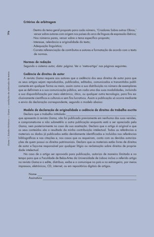 Normas de redação Segundo o sistema autor, data: página. Ver o ‘meta-artigo’ nas páginas seguintes. Cedência de direitos de autor A revista Gama requere aos autores que a cedência dos seus direitos de autor para que os seus artigos sejam reproduzidos, publicados, editados, comunicados e transmitidos publicamente em qualquer forma ou meio, assim como a sua distribuição no número de exemplares que se definirem e a sua comunicação pública, em cada uma das suas modalidades, incluindo a sua disponibilização por meio eletrónico, ótico, ou qualquer outra tecnologia, para fins exclusivamente científicos e culturais e sem fins lucrativos. Assim a publicação só ocorre mediante o envio da declaração correspondente, segundo o modelo abaixo: Modelo de declaração de originalidade e cedência de direitos do trabalho escrito Declaro que o trabalho intitulado: que apresento à revista Gama, não foi publicado previamente em nenhuma das suas versões, e comprometo-me a não submetê-lo a outra publicação enquanto está a ser apreciado pela Gama, nem posteriormente no caso da sua aceitação. Declaro que o artigo é original e que os seus conteúdos são o resultado da minha contribuição intelectual. Todas as referências a materiais ou dados já publicados estão devidamente identificados e incluídos nas referências bibliográficas e nas citações e, nos casos que os requeiram, conto com as devidas autorizações de quem possui os direitos patrimoniais. Declaro que os materiais estão livres de direitos de autor e faço-me responsável por qualquer litígio ou reclamação sobre direitos de propriedade intelectual. No caso de o artigo ser aprovado para publicação, autorizo de maneira ilimitada e no tempo para que a Faculdade de Belas-Artes da Universidade de Lisboa inclua o referido artigo na revista Gama e o edite, distribua, exiba e o comunique no país e no estrangeiro, por meios impressos, eletrónicos, CD, internet, ou em repositórios digitais de artigos. Nome Assinatura