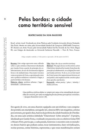 Rauscher, Beatriz Basile da Silva (2013) “Pelas bordas: a cidade como território sensível.” Revista Gama, Estudos Artísticos. ISSN 2182-8539, e-ISSN 2182-8725. Vol. 1 (1): pp. 20-25.