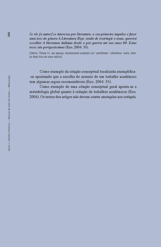 Como exemplo da citação conceptual localizada exemplifica-se apontando que a escolha do assunto de um trabalho académico tem algumas regras recomendáveis (Eco, 2004: 33). Como exemplo de uma citação conceptual geral aponta-se a metodologia global quanto à redação de trabalhos académicos (Eco, 2004). Os textos dos artigos não devem conter anotações nos rodapés.