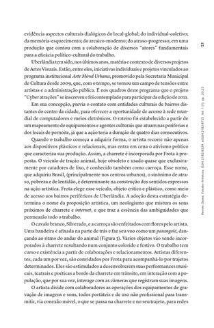 evidência aspectos culturais dialógicos do local-global; do individual-coletivo; da memória-esquecimento; do arcaico-moderno; do atraso-progresso; em uma produção que contou com a colaboração de diversos “atores” fundamentais para a eficácia político-cultural do trabalho. Uberlândia tem sido, nos últimos anos, matéria e contexto de diversos projetos de Artes Visuais. Estão, entre eles, iniciativas individuais e projetos vinculados ao programa institucional Arte Móvel Urbana, promovido pela Secretaria Municipal de Cultura desde 2009, que, com o tempo, se tornou um campo de tensões entre artistas e a administração pública. É nos quadros deste programa que o projeto “Cyber atrações” se inscreveu e foi contemplado para participar da edição de 2011. Em sua concepção, previa o contato com entidades culturais de bairros distantes do centro da cidade, para oferecer a oportunidade de acesso à rede mundial de computadores e meios eletrônicos. O roteiro foi estabelecido a partir de um mapeamento de equipamentos e agentes culturais que atuam nas periferias e dos locais de pernoite, já que a ação teria a duração de quatro dias consecutivos. Quando o trabalho começa a adquirir forma, o artista recorre não apenas aos dispositivos plásticos e relacionais, mas entra em cena o ativismo político que caracteriza sua produção. Assim, a charrete é incorporada por Frota à proposta. O veículo de tração animal, hoje obsoleto e usado quase que exclusivamente por catadores de lixo, é conhecido também como carroça. Esse nome, que adquiriu Brasil, (principalmente nos centros urbanos), o sinônimo de atraso, pobreza e de lentidão, é determinante na construção dos sentidos expressos na ação artística. Frota elege esse veículo, objeto crítico e plástico, como meio de acesso aos bairros periféricos de Uberlândia. A adoção desta estratégia determina o nome da proposição artística, um neologismo que mistura os sons próximos de charrete e internet, e que traz a essência das ambiguidades que permearão todo o trabalho. O cavalo branco, Silverado, e a carroça são enfeitados com flores pelo artista. Uma bandeira é afixada na parte de trás e faz seu voo como um parangolé, dançando ao ritmo do andar do animal (Figura 3). Vários objetos vão sendo incorporados à charrete resultando num conjunto colorido e festivo. O trabalho tem curso e existência a partir de colaborações e relacionamentos. Artistas diferentes, cada um por vez, são convidados por Frota para acompanhá-lo por trajetos determinados. Eles são estimulados a desenvolverem suas performances musicais, teatrais e poéticas a bordo da charrete em trânsito, em interação com a população, que por sua vez, interage com as câmeras que registram suas imagens. O artista divide com colaboradores as operações dos equipamentos de gravação de imagens e sons, todos portáteis e de uso não profissional para transmitir, via conexão móvel, o que se passa na charrete e no seu trajeto, para redes