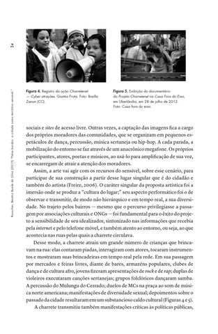 sociais e sites de acesso livre. Outras vezes, a captação das imagens fica a cargo dos próprios moradores das comunidades, que se organizam em pequenos espetáculos de dança, percussão, música sertaneja ou hip-hop. A cada parada, a mobilização do entorno se faz através de um anacrônico megafone. Os próprios participantes, atores, poetas e músicos, ao usá-lo para amplificação de sua voz, se encarregam de atrair a atenção dos moradores. Assim, a arte vai agir com os recursos do sensível, sobre esse cenário, para participar de sua construção a partir desse lugar singular que é do cidadão e também do artista (Freire, 2006). O caráter singular da proposta artística foi a imersão onde se produz a “cultura do lugar;” seu aspecto performático foi o de observar e transmitir, de modo não hierárquico e em tempo real, a sua diversidade. No trajeto pelos bairros — mesmo que o percurso privilegiasse a passagem por associações culturais e ONGs — foi fundamental para o êxito do projeto a sensibilidade de seu idealizador, sintonizado nas informações que recebia pela internet e pelo telefone móvel, e também atento ao entorno, ou seja, ao que acontecia nas ruas pelas quais a charrete circulava. Desse modo, a charrete atraiu um grande número de crianças que brincavam na rua: elas contaram piadas, interagiram com atores, tocaram instrumentos e mostraram suas brincadeiras em tempo real pela rede. Em sua passagem por mercados e feiras livres, diante de bares, armazéns populares, clubes de dança e de cultura afro, jovens fizeram apresentações de rock e de rap; duplas de violeiros executaram canções sertanejas; grupos folclóricos dançaram samba. A percussão do Mulungu do Cerrado; duelos de MCs na praça ao som de música norte americana; manifestações de diversidade sexual; depoimentos sobre o passado da cidade resultaram em um substancioso caldo cultural (Figuras 4 e 5). A charrete transmitiu também manifestações críticas às políticas públicas,