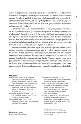 Chareteando: [Consult 2012-11-28]. Disponível em <URL: http://grupotamboril. wordpress.com/tag/charrete-net/> Freire, Cristina (2006) Contexturas: Sobre artistas e/ou antropólogos in Lagnado, Lisette; Pedrosa, Adriano (Orgs.). 27ª. Bienal de São Paulo: Como viver junto. São Paulo: Fundação Bienal. ISBN:858529829-4 Rancière, Jacques (2010) Estética e Política. A partilha do sensível. Entrevista e glossário por Gabriel Rockhill; tradução Vanessa Brito. Porto: Dafne Editora. ISBN: 978-989-8217-09-7