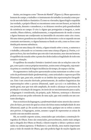 Assim, em imagens como “Nuvem da Manhã” (Figura 1), Ohara apresenta o homem do campo, o trabalho e o instrumento de trabalho (a enxada) como partes de um todo lúdico e fantástico. É como se o lavrador, figura frágil e esquálida (na verdade, o próprio Ohara) se encontrasse como em um frenesi, ao início de sua jornada, durante o amanhecer, e se deixasse envolver pela grandiosidade da existência no campo. O céu é a figura que protagoniza a imagem, e, neste sentido, Ohara elabora, cuidadosamente, o enquadramento de modo a tornar a figura humana um coadjuvante na imensidão do encontro entre céu e terra. Há uma síntese grandiosa nas relações dos elementos: o céu se expande em um constante movimento, e a figura humana se funde ao solo, como se fosse constituída pela mesma substância. Como em uma dança de vitória, a figura triunfa sobre a terra, a natureza e o trabalho, colocando-se a si mesma como uma criança (Figura 3). Porém, o cigarro na boca, faz-nos lembrar que este não é um menino, mas sim um homem. O equilíbrio da enxada sobre a ponta dos dedos indica a fragilidade de todo este cenário e situação. O equilibrar da enxada é fortuito e instável como são as relações com o lugar, com o país e com as próprias memórias, assim como a fotografia, cuja matéria prima se constitui de frágeis incidências do tempo, do espaço e da luz. Os argumentos e indicações apresentados acima sustentam-se sobre o conceito de performatividade (performativity), como articulado e expresso por Elin Diamond e que, para nós, estende-se ao âmbito das representações fotográficas. Este é um conceito derivado, primeiramente, de análises linguísticas das representações sobre a pessoa (Diamond, 1996: 152-172) e os indivíduos, de modo geral, mas que tem sido ampliado, de modo a alcançar os processos de produção e veiculação de imagens. Ao invés de ser um instrumento para a ação, a linguagem é considerada, ela própria, ação. Palavras, sentenças e discursos podem evocar um poder referente de uma ação, que está contida em um contexto ideológico. Para os teóricos da linguagem, a performatividade existe através das convenções do fazer, por meio do qual as coisas são feitas numa multiplicidade de atos (Diamond, 1996: 5). De acordo com esta visão, qualquer ato se refere a outros atos prévios. A linguagem, assim, assume o papel de representar as coisas de acordo com um modelo ausente. Há, no sentido exposto acima, enunciados que articulam a construção fotográfica de Ohara. Estes são enunciados, provavelmente, muito mais antigos que a chegada dos Ohara ao Brasil, e dizem respeito a ideias e práticas enraizadas na cultura japonesa. O Budismo é, sem dúvida, uma matriz importante para a visão de mundo de Ohara, que não poderia fugir de noções ligadas aos