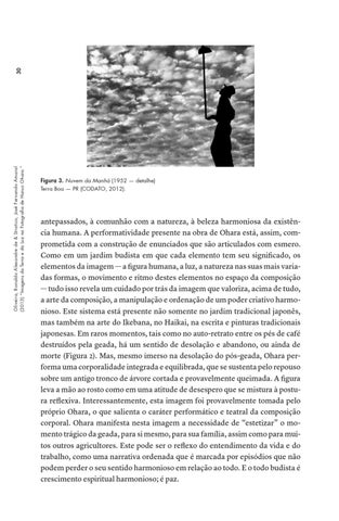 antepassados, à comunhão com a natureza, à beleza harmoniosa da existência humana. A performatividade presente na obra de Ohara está, assim, comprometida com a construção de enunciados que são articulados com esmero. Como em um jardim budista em que cada elemento tem seu significado, os elementos da imagem — a figura humana, a luz, a natureza nas suas mais variadas formas, o movimento e ritmo destes elementos no espaço da composição — tudo isso revela um cuidado por trás da imagem que valoriza, acima de tudo, a arte da composição, a manipulação e ordenação de um poder criativo harmonioso. Este sistema está presente não somente no jardim tradicional japonês, mas também na arte do Ikebana, no Haikai, na escrita e pinturas tradicionais japonesas. Em raros momentos, tais como no auto-retrato entre os pés de café destruídos pela geada, há um sentido de desolação e abandono, ou ainda de morte (Figura 2). Mas, mesmo imerso na desolação do pós-geada, Ohara performa uma corporalidade integrada e equilibrada, que se sustenta pelo repouso sobre um antigo tronco de árvore cortada e provavelmente queimada. A figura leva a mão ao rosto como em uma atitude de desespero que se mistura à postura reflexiva. Interessantemente, esta imagem foi provavelmente tomada pelo próprio Ohara, o que salienta o caráter performático e teatral da composição corporal. Ohara manifesta nesta imagem a necessidade de “estetizar” o momento trágico da geada, para si mesmo, para sua família, assim como para muitos outros agricultores. Este pode ser o reflexo do entendimento da vida e do trabalho, como uma narrativa ordenada que é marcada por episódios que não podem perder o seu sentido harmonioso em relação ao todo. E o todo budista é crescimento espiritual harmonioso; é paz.