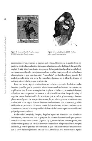 personajes pertenecientes al mundo del cómic. Respecto a la parte de su repertorio centrada en el mimetismo con el entorno, cabe hablar de la serie Camuflaje (1999-2001), en la que se apropia del espacio fundiéndose en él al mimetizarse con el suelo, paisajes naturales o teselas, cuyo precedente se halla en el vestido con el que paseó en 1997 “camuflada” por la Alhambra, y a partir del cual desarrolla toda una serie de camuflajes basados en la idea de simular el entorno a través de la propia vestimenta. Para esta serie, Agrela confecciona un variado repertorio de disfraces elaborados por ella, que le permiten mimetizarse con los distintos escenarios escogidos (de una floresta a una piscina, la playa, el baño…), y a través de los que reflexiona sobre aspectos en torno a la identidad femenina, la apariencia y el engaño, ya que la simulación del ambiente que le rodea, y las coreografías que plantea en algunas de sus performances, le permiten generar un efecto contradictorio: el de lograr la total fusión u ocultamiento con el entorno, y el de evidenciar su presencia. Si bien a través de los mismos, plantea también otras cuestiones como es la homogeneidad de la sociedad contemporánea occidental y el peligro que conlleva. En la serie Camuflaje, Parquet, Ángeles Agrela se mimetiza con interiores domésticos, en concreto con el parquet del cuarto de estar en el que aparece camuflada como suelo o mesa (Figuras 1 y 2), mostrándose como soporte, ataviada con un gorro y un vestido-forro que reproduce a la perfección el parquet del suelo, y con el que crea un disfraz en el que se han observado asociaciones con la labor de la mujer como ama de casa. A través de esta mujer-mesa, Agrela
