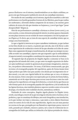 parece disolverse con el entorno, transformándose en un objeto cotidiano, aspecto este que forma parte también de otros de sus camuflajes interiores. Por medio de este camuflaje con el entorno, Agrela lleva también a cabo una performance en el jardín granadino Carmen de los Mártires, para la que realiza un exuberante y divertido disfraz compuesto de un mono y un enorme gorro cubierto de trozos de tela que simulan ser hojarasca, y con el que logra “pasar desapercibida” (Figura 3). Otra de sus performances-camuflaje a destacar es Arena (2000-2001), y en esta ocasión, y como elemento principal de interés, la artista aparece danzando en una playa arenosa con un vestido de tonos semejantes a los de la propia arena (Figura 4). Es decir, que se trata de una especie de camuflaje irónico que se rompe con el movimiento. Lo que a Agrela le interesa no es pues camuflarse totalmente, ya que incluso en las fotos donde no se mueve, es patente que está ahí, sino el de llevar a cabo unas experiencias de ocultación a través de las que ahondar en la idea de camuflaje como argumento de juego y transformación, de ahí que sea siempre reconocible en todos sus camuflajes, aspecto este que responde a que la artificialidad y el aspecto teatral y escenográfico constituyen los aspectos claves de su trabajo. El segundo tipo de propuesta de Ángeles Agrela a comentar se basa en la apropiación del mundo del cómic, ya que entre su amplio repertorio de disfraces opta también por asumir la apariencia de personajes imaginarios, inmortales, con poderes sobrenaturales. Un tema, el del héroe enmascarado, que gira en torno a la iconografía popular del superhéroe, quien de forma innata tiene súper poderes que debe usar para ayudar a los demás por un imperativo de orden moral, y en este caso Agrela habla de los artistas que se ven a sí mismos de esta manera. Estos conceptos son expresados por la artista de forma lúdica, asumiendo un rol de súper-heroína para recrear unas ficciones como las realizadas por los superhéroes a lo largo de la historia, y a través de las que busca no sólo formar parte de la iconografía popular del superhéroe y de la tradición de las figuras heroicas, sino también plantear aspectos sociales como es la noción de juego, o la relación entre realidad y ficción, naturaleza y artificio. Partiendo de estos conceptos, Ángeles Agrela plantea La Elegida (20032006), una trilogía a través de la que investiga la relación entre el artista y el superhéroe, y que se constituye de dibujos, una serie fotográfica y una instalación, en la que incluye sus trajes y máscaras, y que junto a otros objetos funcionan como los rastros de la vida de una superheroína. Agrela crea así unas puestas en escena en las que, protegida por sus llamativos supertrajes parece surcar el cielo, pasando por ciudades, museos y países, tal y como lo evidencian las escenografías de fondo que utiliza en imitación a las típicas portadas de cómics,