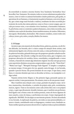 da sonoridade se manter a mesma: hentre/ hos/ hanimais/ hestranhos/ heu/ hescolho/ hos/ humanos. No entanto, todos os versos culminam na palavra humanos, como se todos os animais hestranhos citados pudessem, pela grafia, se aproximar do ser humano, e é justamente na palavra humano, sem erros de grafia, que a tinta surge mais borrada e ruidosa, resultante da tinta escorrida proveniente da escrita das outras palavras: como se fosse o nosso sangue, que circula por nossas veias, e nos mantém vivos: hanimais, e hestranhos: humanos. E, pela forma como se construiu a palavra humanos, com a tinta escorrida, mas também com a ação de desenhar, lemos também manos, de irmãos. Diferentes, mas iguais. Hentranhas, hestranhos. Não estamos sozinhos, somos todos nós: cabeça, tronco, pés, mãos, coração, fluidos: hu-manos. ... 2. O Corpo